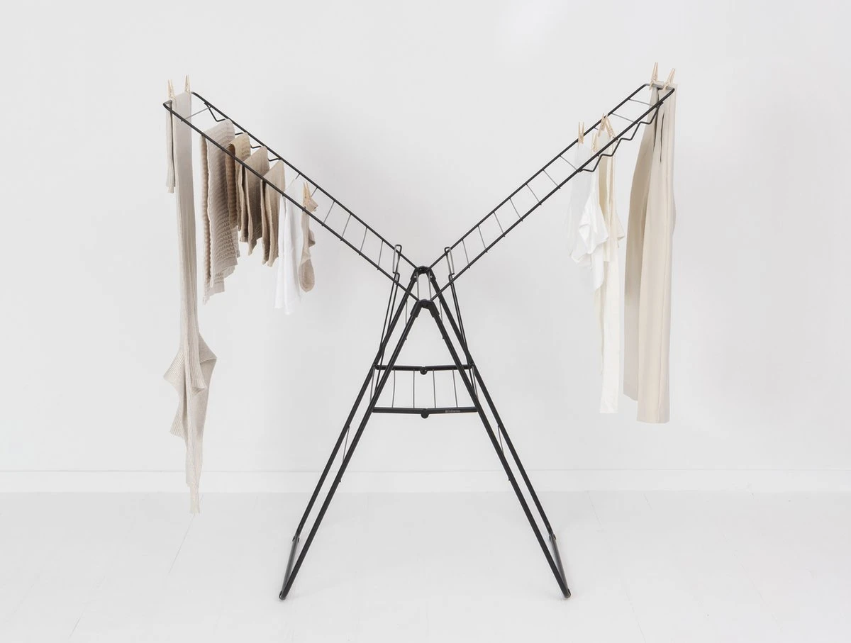 Bespaar tijd en energie door je was natuurlijk te drogen en bespaar ruimte door het met dit slimme Wasrek te doen! Dit supersize Brabantia HangOn Droogrek – 25 meter – Matt Black geeft je de ruimte met ook nog eens 8 haken voor kledinghangers. Alles droog? Klap ‘m eenvoudig in tot een klein pakketje en berg ‘m op. Wat een kek rek!