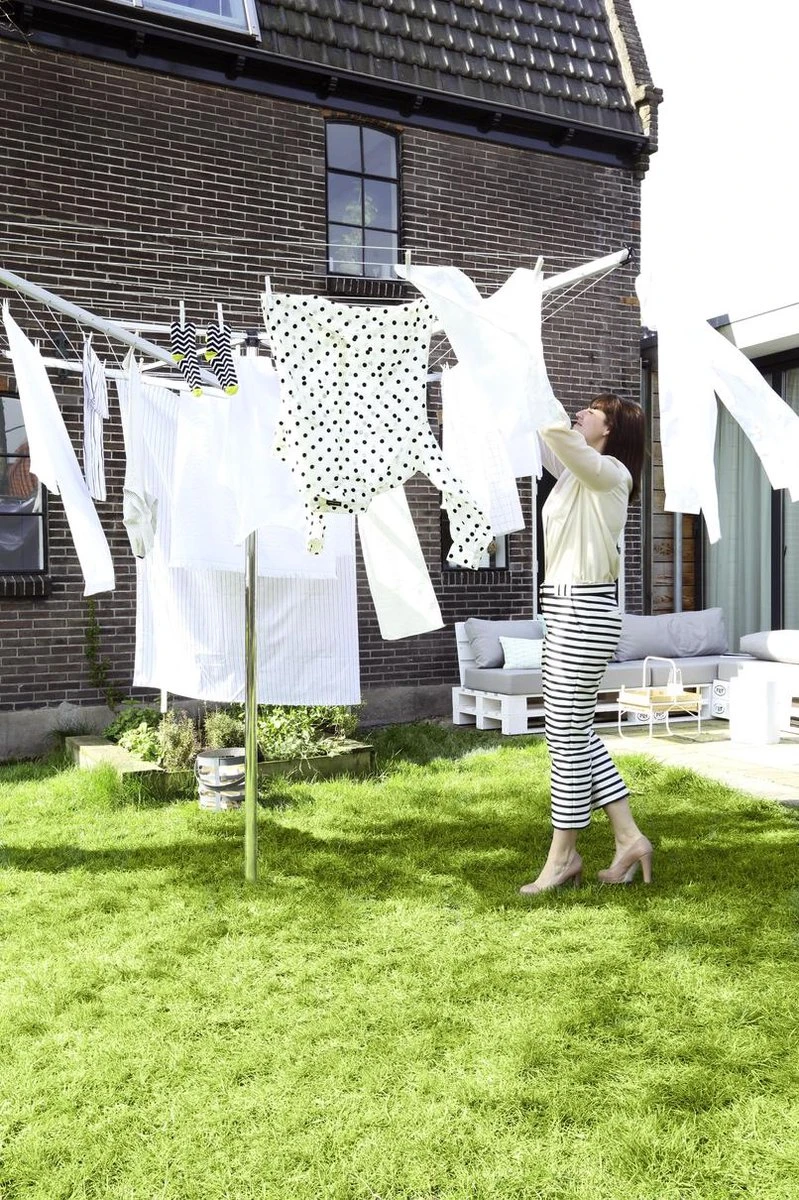 Gemakkelijk en milieuvriendelijk je was drogen met een Brabantia Topspinner Droogmolen van 40 meter met betonanker van 45 mm doorsnee. Met de Topspinner Droogmolen kun je de was snel en gemakkelijk buiten drogen, dankzij de soepeldraaiende armen en de kwalitatieve drooglijn. Met het gebruiksvriendelijke ‘paraplu’-systeem draait de droogmolen onafhankelijk van de paal, de drooglijnen komen naar je toe. Het bijna wrijvingloze design waarborgt dat de armen met de drooglijnen soepel draaien, zelfs als ze beladen zijn met zwaar of nat wasgoed. Dit betekent ook dat de Topspinner Droogmolen gemakkelijker in de wind draait, waardoor de was zelfs sneller droogt. Fris en ‘gratis’ je was drogen want buiten drogen is beter voor het milieu én je portemonee. Meer droogcomfort dankzij de soepeldraaiende armen, ook vol natte was en geen gesjouw meer met de wasmand. Met het afsluitbare kunststof betonanker is deze droogmolen gemakkelijk in het beton te plaatsen.